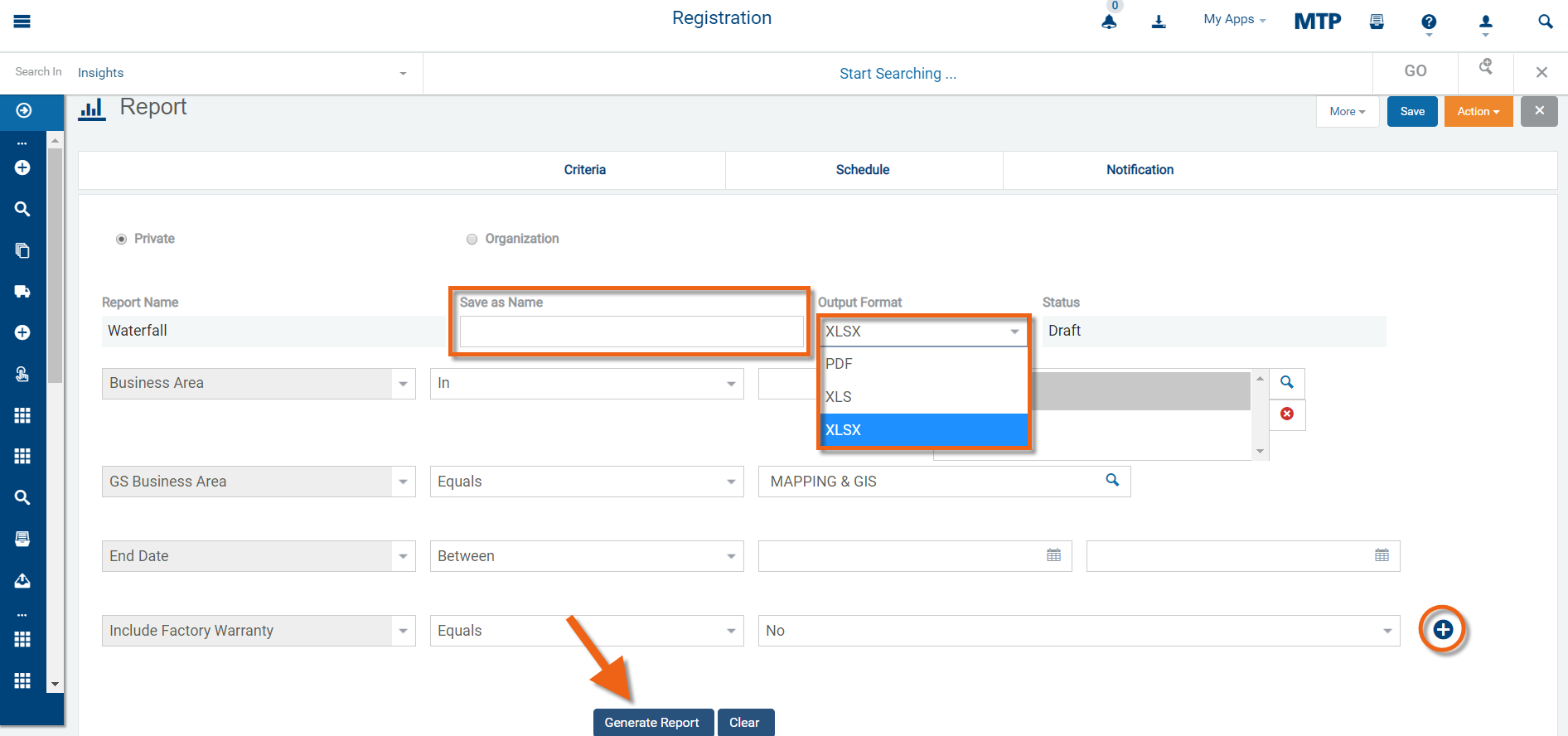 Add the criteria required for the report using the "+" and select the required criteria.