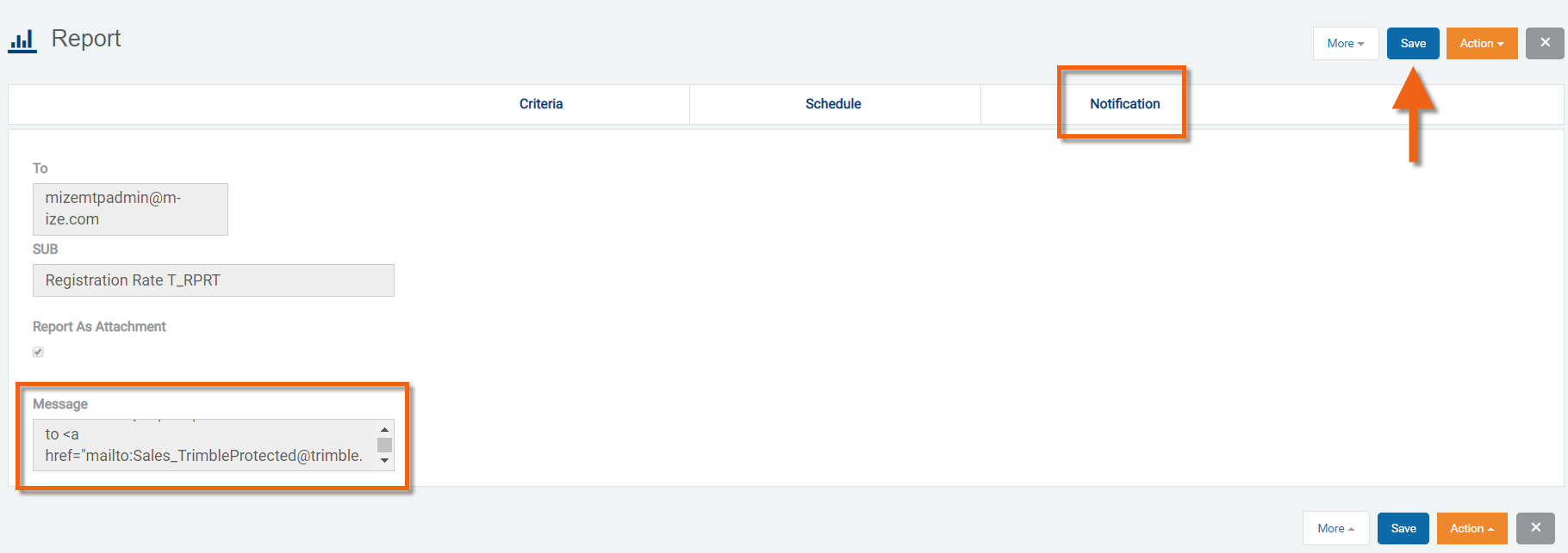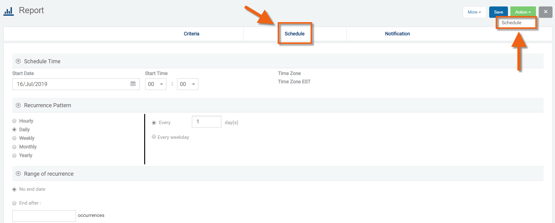 Click the "Action" button and select "Schedule" to save and schedule this report.